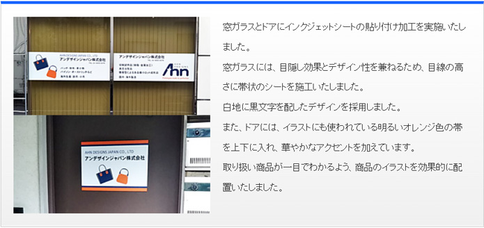 ![]() ドアのガラス部分に企業のロゴのアクリルプレートを貼りつけました。 |